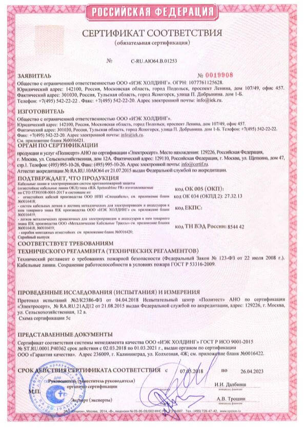 Рассмотрим конкретный пример: сертификат соответствия на ОКЛ IEK Spetskabline FR, включающую огнестойкий кабель НПП «Спецкабель», перфорированные, неперфорированные и проволочные металлические лотки IEK®, а также огнестойкие монтажные коробки производства ФНПП «Гефест», компании «Ленспецавтоматика» и ОПП «Элмет». В приложении к сертификату прописаны все возможные для использования марки кабелей с разными характеристиками и номинальными сечениями и все допустимые системы металлических кабельных лотков, указано фактическое время работоспособности линии в случае пожара и обозначены технические условия (ТУ), в соответствии с которыми изготовлена продукция.