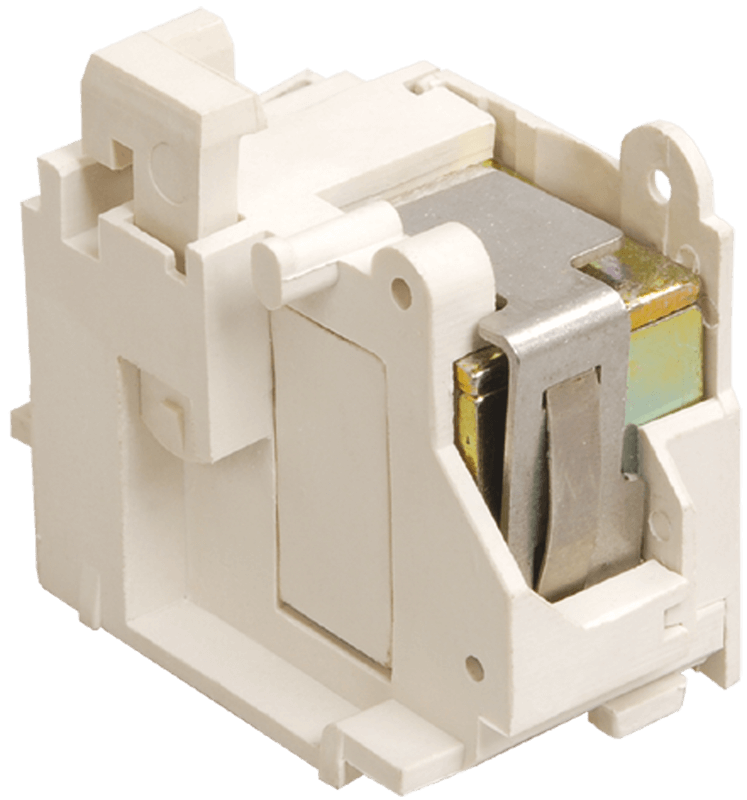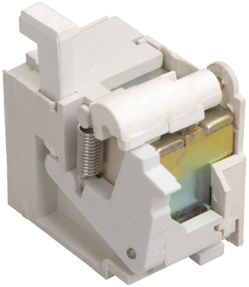 При подаче на выводы расцепителя переменного напряжения 220В с частотой 50 Гц толкатель расцепителя воздействует на рейку сброса, чем вызывает срабатывание механизма свободного расцепления и отключение автоматического выключателя. Отключение происходит, по сути, как при нажатии на кнопку «ТЕСТ». Выпускаются в трех типах исполнения: для ВА88-32/33, ВА88-35/37 и ВА88-40/43 IEK®.